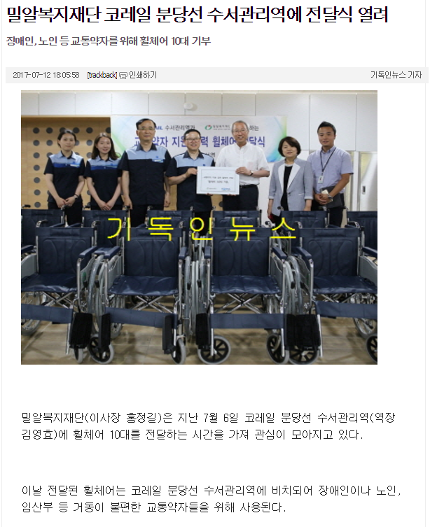 [아이굿뉴스] 밀알복지재단, 수서관리역에 휠체어 기부