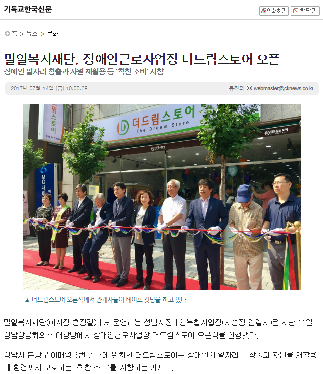 [기독교한국신문] 밀알복지재단, 장애인근로사업장 더드림스토어 오픈