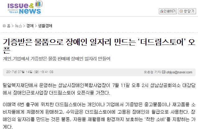 [이슈와뉴스] 기증받은 물품으로 장애인 일자리 만드는 ‘더드림스토어’ 오픈