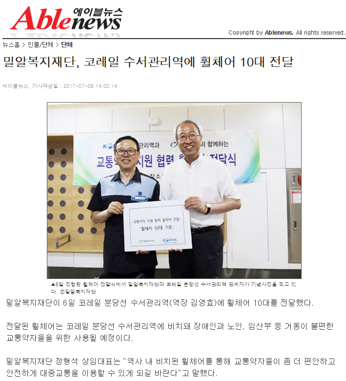 [에이블뉴스] 밀알복지재단, 코레일 수서관리역에 휠체어 10대 전달