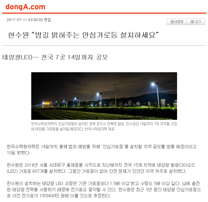 [동아일보] 한수원 “밤길 밝혀주는 안심가로등 설치하세요”