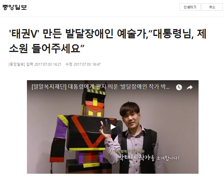 [중앙일보] '태권V' 만든 발달장애인 예술가,“대통령님, 제 소원 들어주세요”
