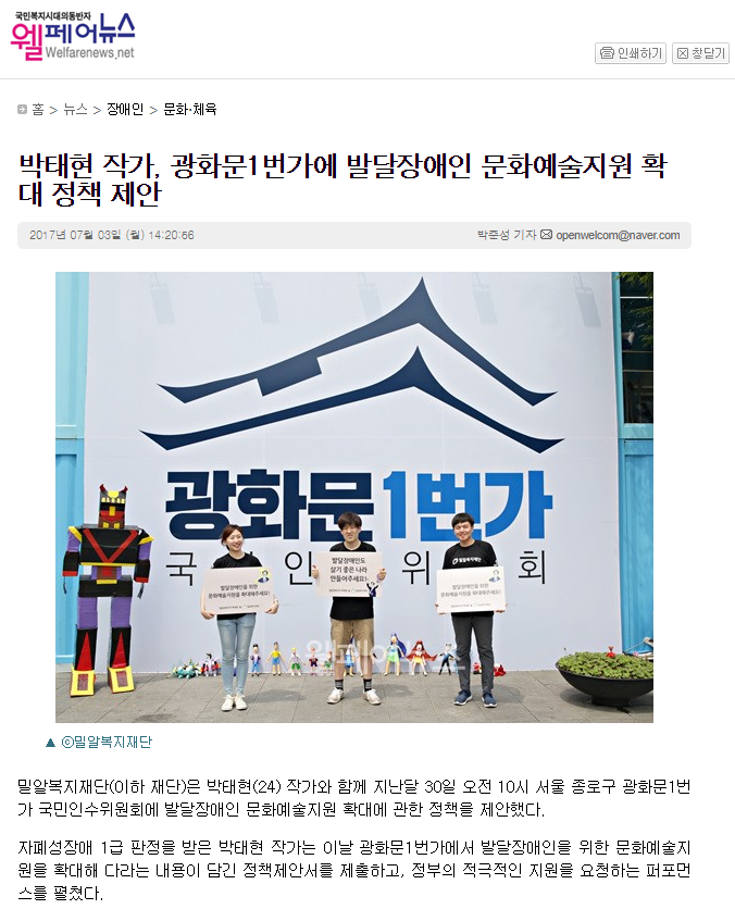 [웰페어뉴스] 박태현 작가, 광화문1번가에 발달장애인 문화예술지원 확대 정책 제안