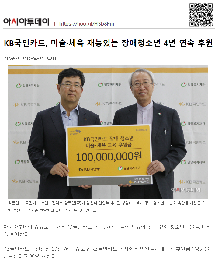 [아시아투데이] KB국민카드, 미술·체육 재능있는 장애청소년 4년 연속 후원