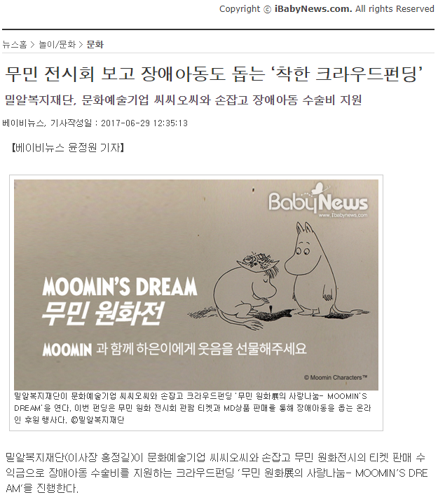 [베이비뉴스] 무민 전시회 보고 장애아동도 돕는 ‘착한 크라우드펀딩’