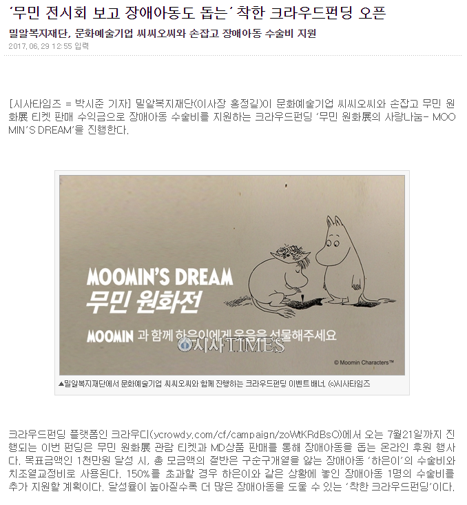 [시사타임즈] ‘무민 전시회 보고 장애아동도 돕는’ 착한 크라우드펀딩 오픈