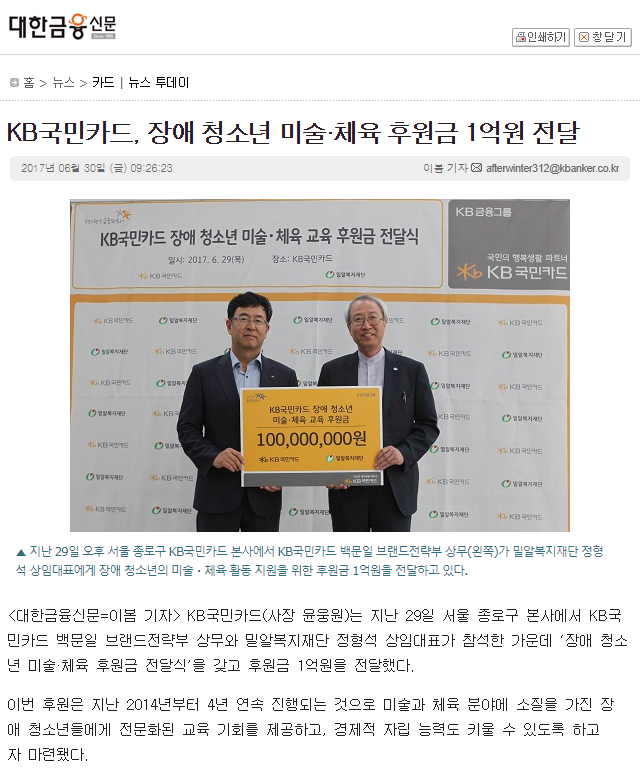 [데일리한국] KB국민카드, 장애 청소년 미술·체육 활동 후원 위해 1억원 기부