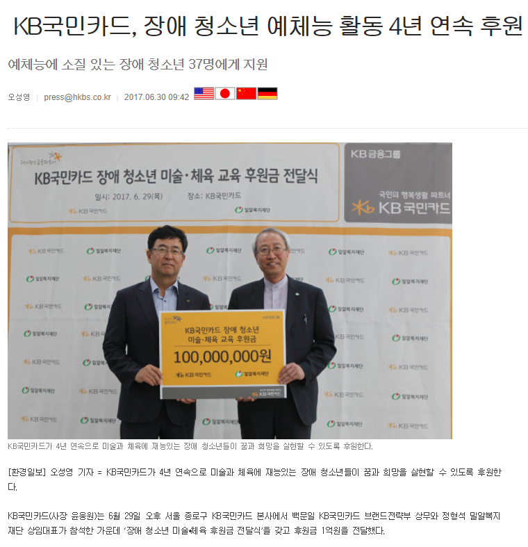 이전 [조세일보] KB국민카드, 장애 청소년 예체능 활동 4년 연속 후원 다음 [에이블뉴스] KB국민카드, ‘장애청소년 꿈 실현’ 후원금 1억원 기부
