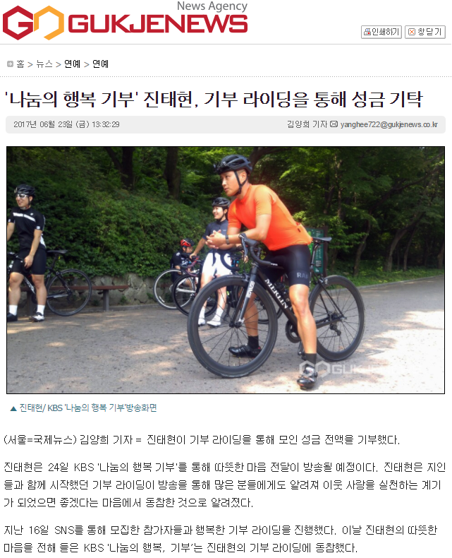 [국제뉴스] '나눔의 행복 기부' 진태현, 기부 라이딩을 통해 성금 기탁