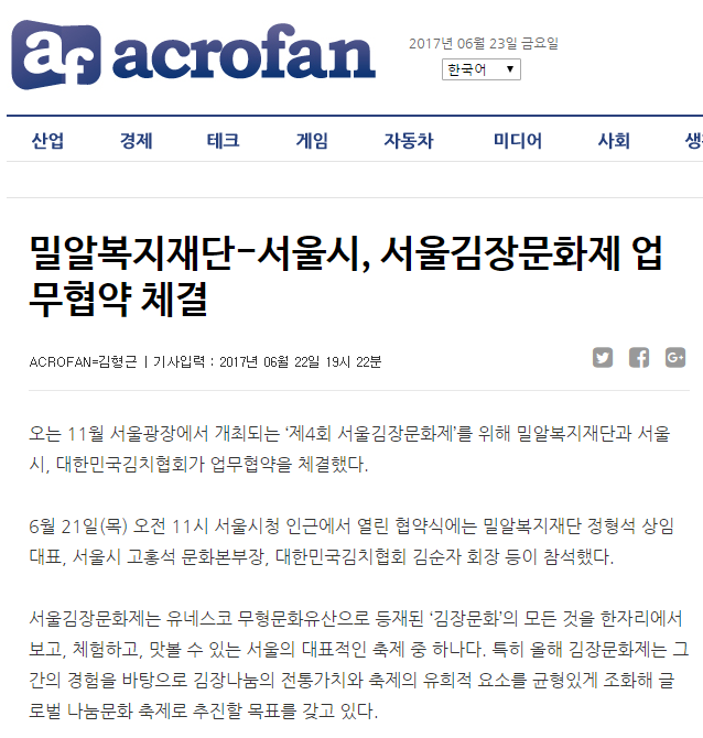 [아크로팬] 밀알복지재단-서울시, 서울김장문화제 업무협약 체결