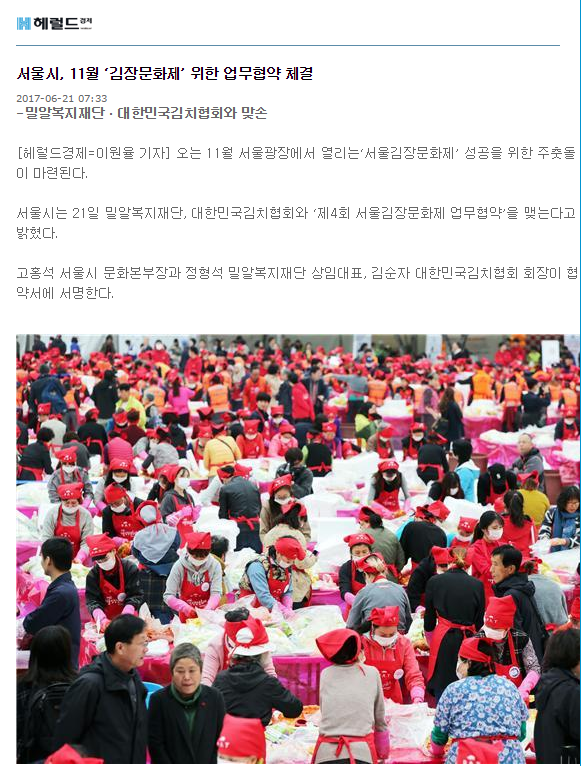 [헤럴드경제] 서울시, 11월 ‘김장문화제’ 위한 업무협약 체결