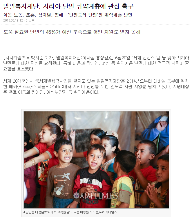 [시사타임즈] 밀알복지재단, 시리아 난민 취약계층에 관심 촉구