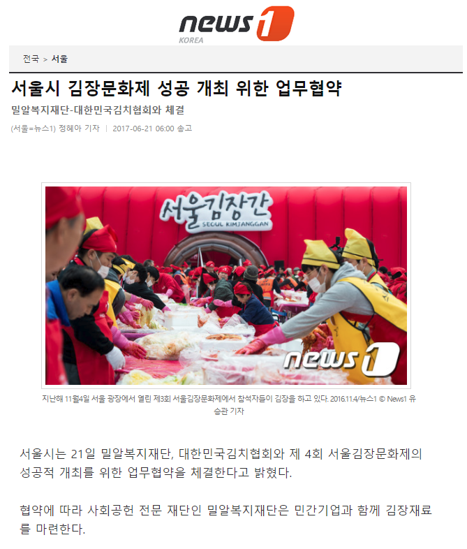 이전 [뉴시스] 서울시, 11월 김장문화제 대비 업무협약 체결 다음 [연합뉴스] 11월 서울광장서 김장문화제…김치 문화 알린다
