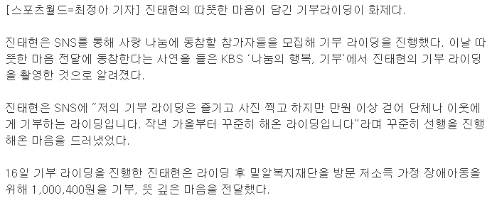 [뉴스엔미디어] 진태현 “행복한 기부라이딩, 밀알복지재단에 전액기부”