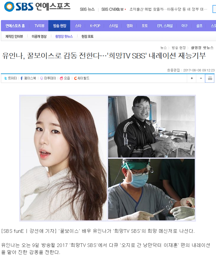 [SBS연예스포츠] 유인나, 꿀보이스로 감동 전한다…'희망TV SBS' 내레이션 재능기부