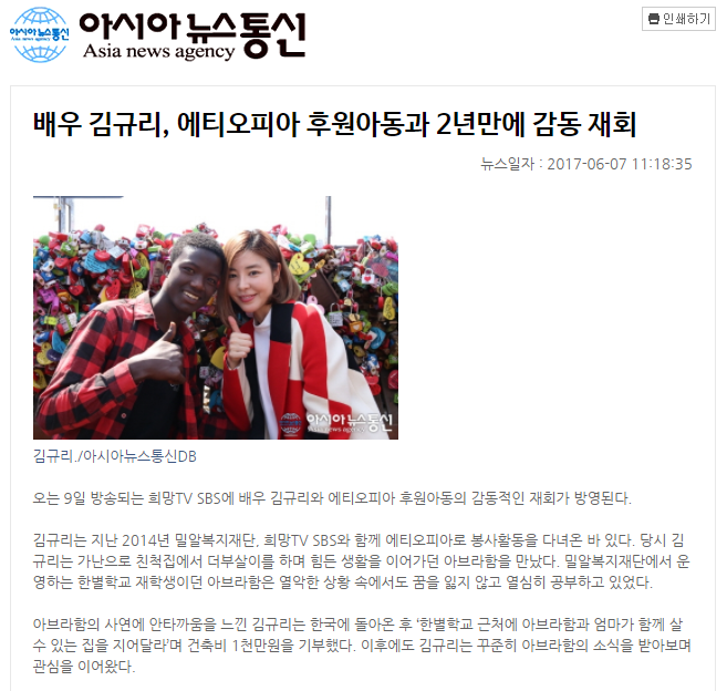 [아시아뉴스통신] 배우 김규리, 에티오피아 후원아동과 2년만에 감동 재회
