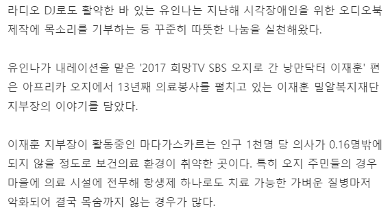 [스포츠서울] 기부천사 유인나 SBS '오지로 간 낭만닥터 이재훈'편 내레이션 참여