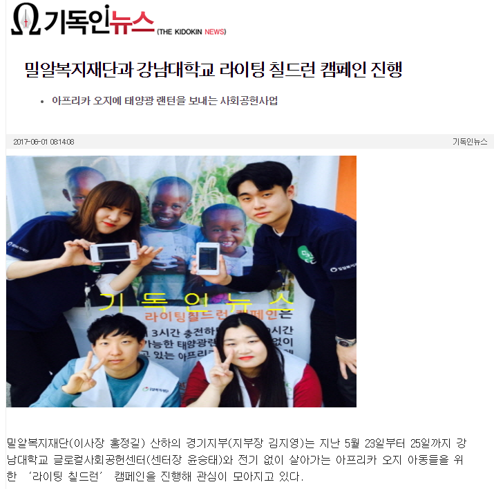 [기독인뉴스] 밀알복지재단과 강남대학교 라이팅 칠드런 캠페인 진행