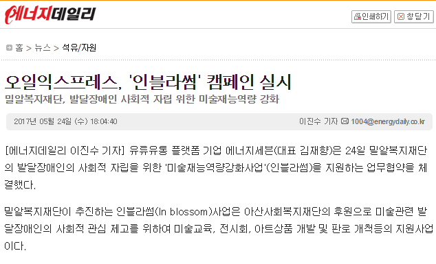 [한국에너지] 오일익스프레스, 밀알복지재단과 인블라썸 캠페인