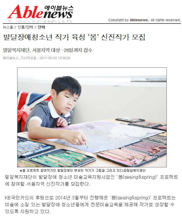 [에이블뉴스] 발달장애청소년 작가 육성 ‘봄’ 신진작가 모집