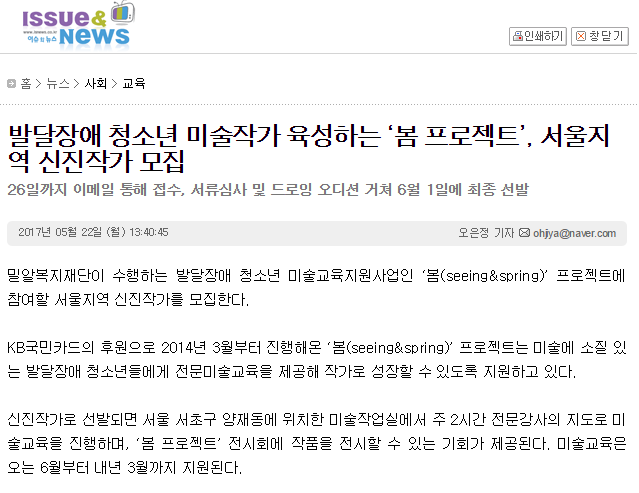 [이슈와뉴스] 발달장애 청소년 미술작가 육성하는 ‘봄 프로젝트’, 서울지역 신진작가 모집