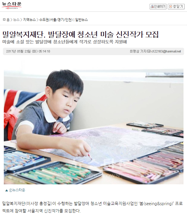 [뉴스타운] 밀알복지재단, 발달장애 청소년 미술 신진작가 모집