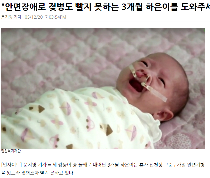 [인사이트] "안면장애로 젖병도 빨지 못하는 3개월 하은이를 도와주세요"