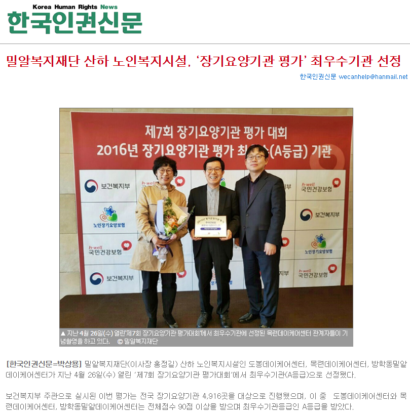 [한국인권신문] 밀알복지재단 산하 노인복지시설, ‘장기요양기관 평가’ 최우수기관 선정