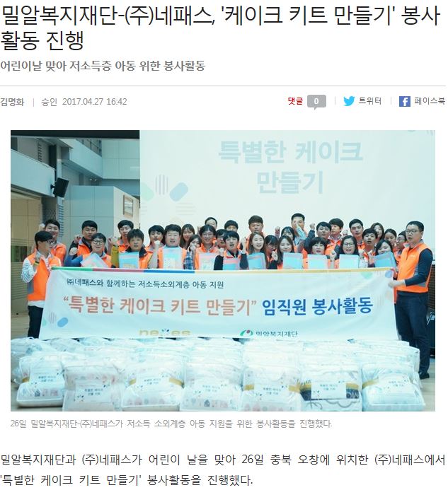 [복지연합신문] 밀알복지재단-(주)네패스, '케이크 키트 만들기' 봉사활동 진행