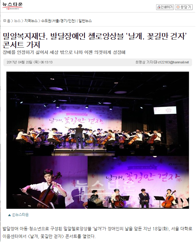 [뉴스타운] 밀알복지재단, 발달장애인 첼로앙상블 ‘날개, 꽃길만 걷자’ 콘서트 가져