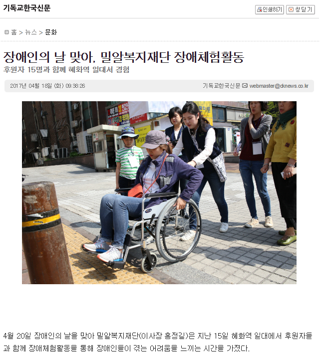 [기독교한국신문] 장애인의 날 맞아, 밀알복지재단 장애체험활동