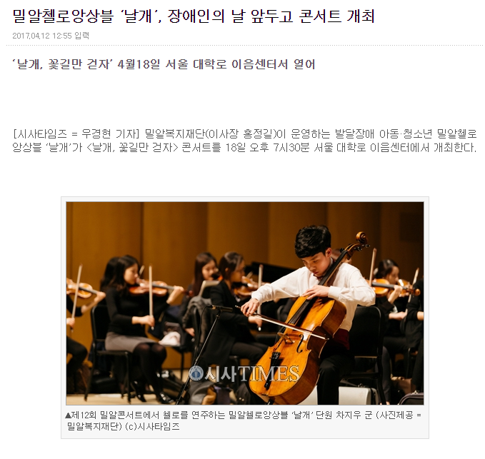 [시사타임즈] 밀알첼로앙상블 ‘날개’, 장애인의 날 앞두고 콘서트 개최