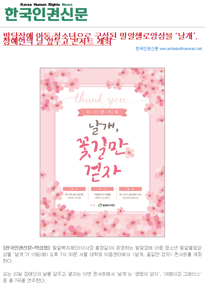[한국인권신문] 발달장애 아동·청소년으로 구성된 밀알첼로앙상블 ‘날개’, 장애인의 날 앞두고 콘서트 개최