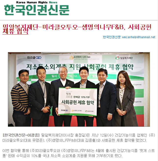 [한국인권신문] 밀알복지재단-미라클오투오-생명의나무F&B, 사회공헌 제휴 협약