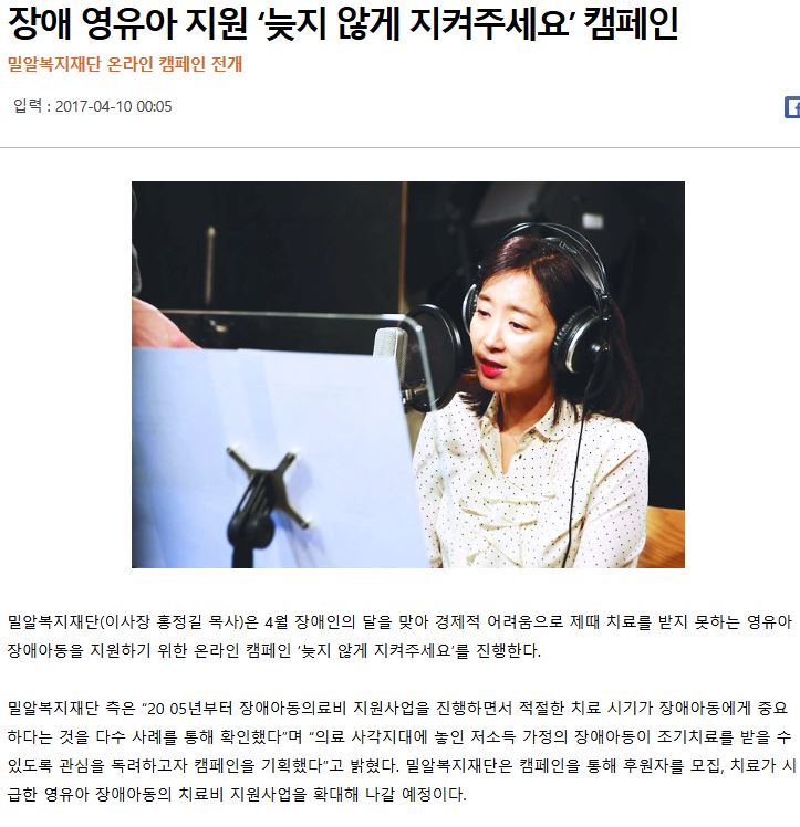 [한국인권신문] 밀알복지재단, 장애아동 제때 치료받도록 “늦지 않게 지켜주세요”