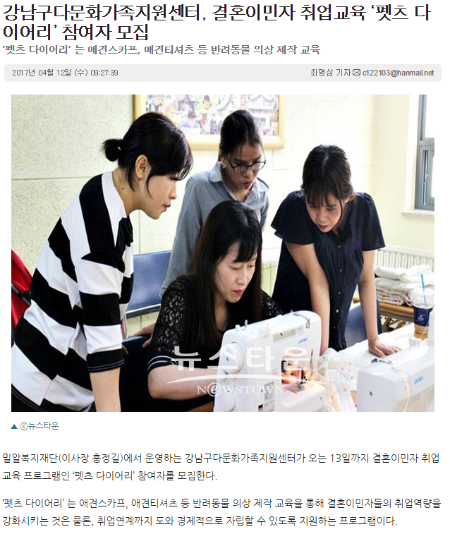 [뉴스타운] 강남구다문화가족지원센터, 결혼이민자 취업교육 ‘펫츠 다이어리’ 참여자 모집