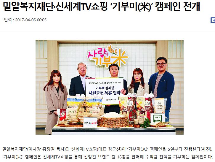 [국민일보] 밀알복지재단·신세계TV쇼핑 ‘기부미(米)’ 캠페인 전개