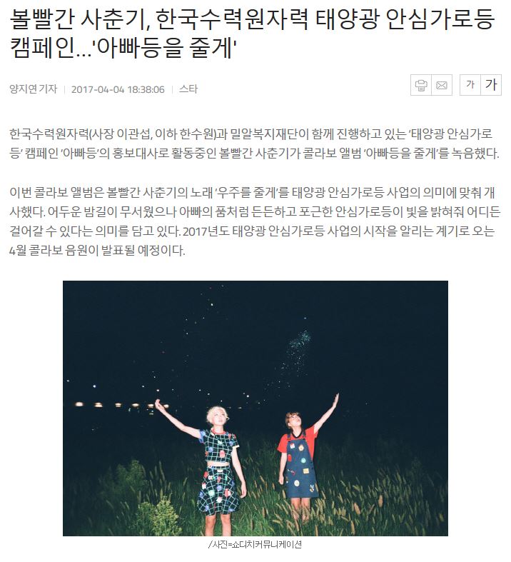 [서울경제] 볼빨간 사춘기, 한국수력원자력 태양광 안심가로등 캠페인…'아빠등을 줄게'