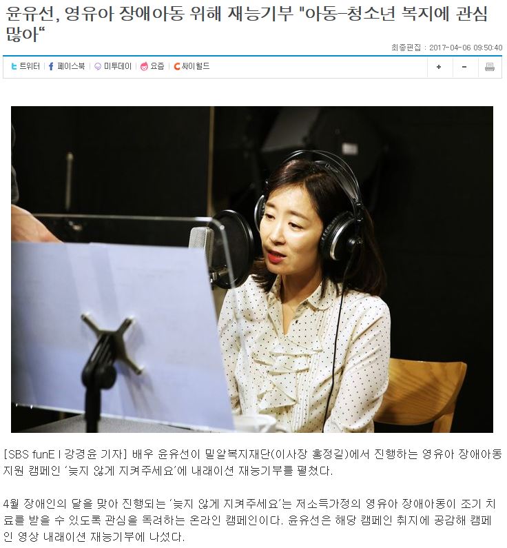 [SBS] 윤유선, 영유아 장애아동 위해 재능기부 "아동-청소년 복지에 관심 많아“