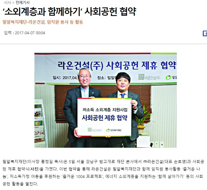 [국민일보] ‘소외계층과 함께하기’ 사회공헌 협약