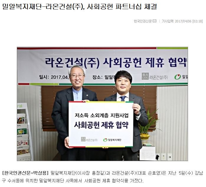 [한국인권신문] 밀알복지재단-라온건설(주), 사회공헌 파트너십 체결