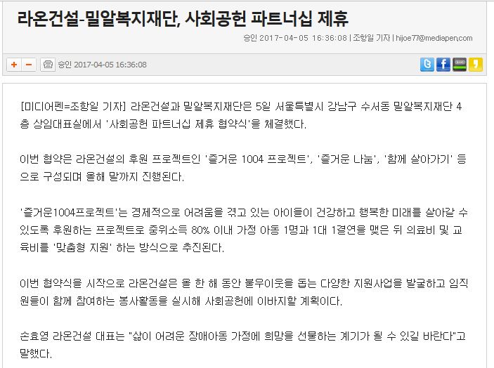 [미디어펜] 라온건설-밀알복지재단, 사회공헌 파트너십 제휴