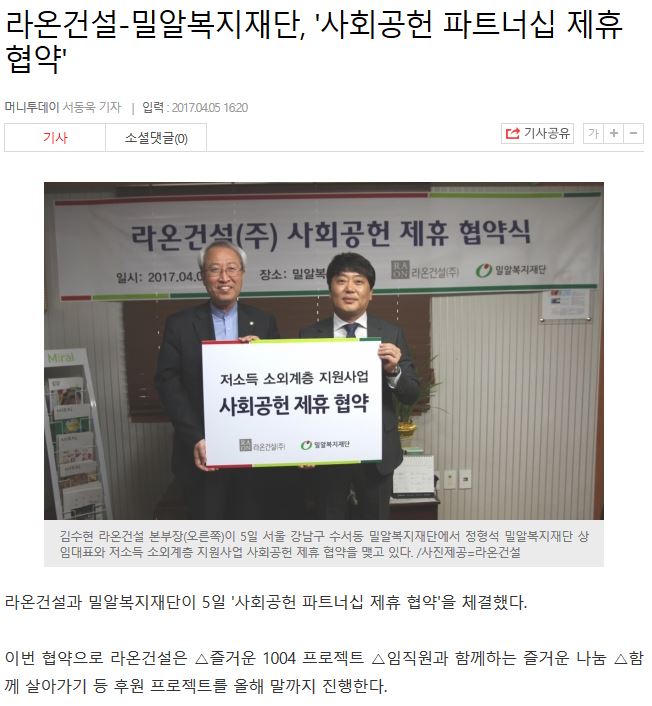 [머니투데이] 라온건설-밀알복지재단, '사회공헌 파트너십 제휴 협약'