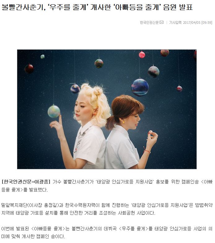 [한국인권신문] 볼빨간사춘기, ‘우주를 줄게’ 개사한 ‘아빠등을 줄게’ 음원 발표