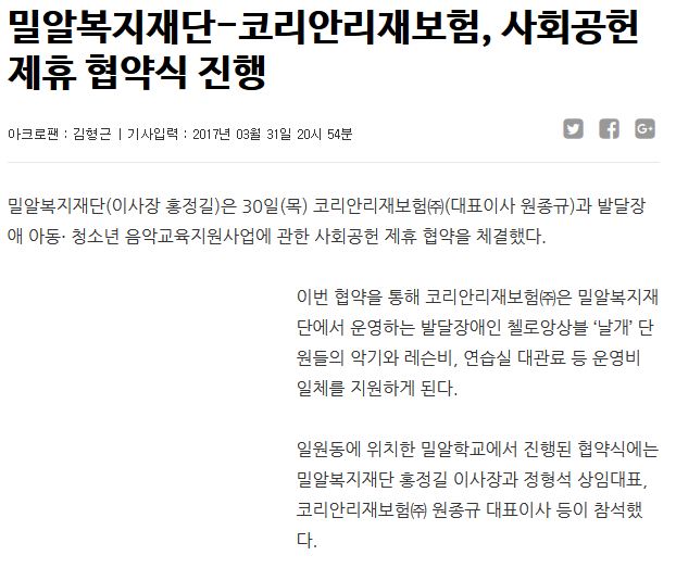 [아크로팬] 밀알복지재단-코리안리재보험, 사회공헌 제휴 협약식 진행