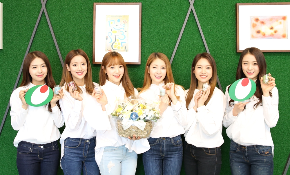‘기부米’ 캠페인 촬영현장에서 걸그룹 에이프릴(왼쪽부터 채원, 나은, 레이첼, 채경, 예나, 진솔)이 기념촬영을 하고 있다.