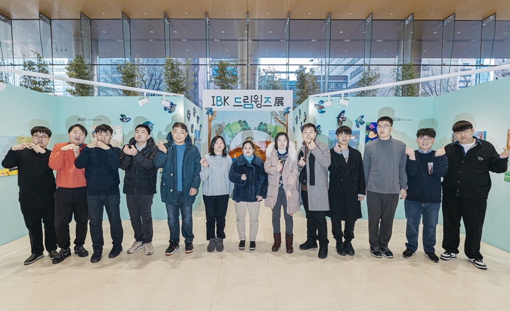 [사진1] 25일(목) 서울 중구 IBK기업은행 본점 1층 로비에서 열린 ‘IBK드림윙즈展’에 작품을 전시한 발달장애인 작가들의 모습.