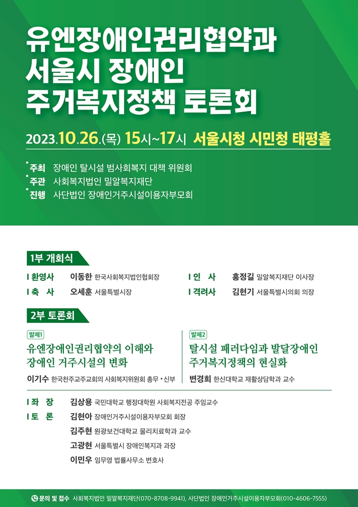 밀알복지재단(이사장 홍정길)이 ‘유엔장애인권리협약과 서울시 장애인 주거복지정책 토론회’를 10월 26일(목) 서울시청 시민청 태평홀에서 개최한다.