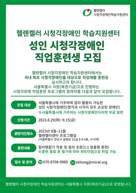 헬렌켈러 시청각장애인 학습지원센터(센터장 정우석)가 시청각장애인의 자립 역량 강화를 위해 8월 29일부터 9월 15일까지 직업훈련생을 모집한다.