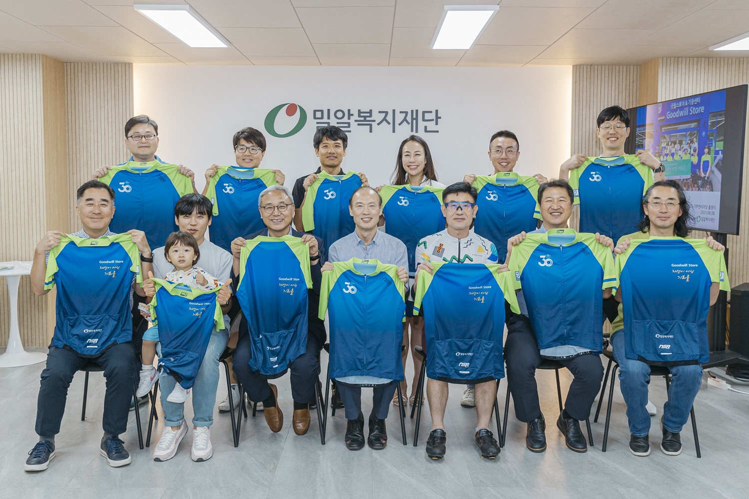 8일 밀알복지재단에서 열린 기부앤라이딩 출정식에서 재단 관계자와 라이더 봉사자들이 유니폼을 들고 기념 촬영을 하고 있다.